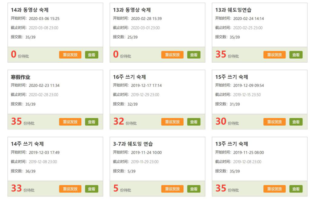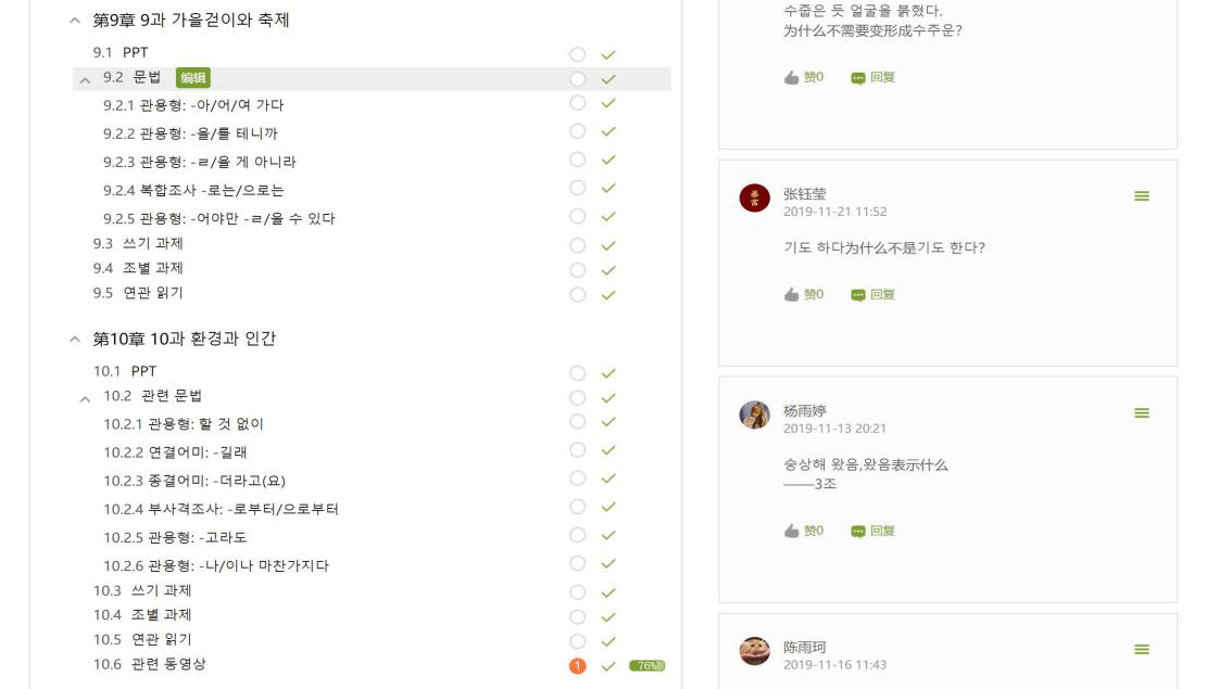 课后:主要有作业和小测验。个人作业中客观题在学习通上完成,主观题在石墨文档完成,发挥平台优势,实现教师批改作业最优化。小组作业采用集体打分方式,既考察了学生的团队协作能力,也通过师生互评方式,让更多的学生参与评价。另外,鉴于目前无法面对面沟通的局限,本学期增加了适合线上完成的“每日韩语新闻播报”等小组活动,丰富了课程活动的多样形式。