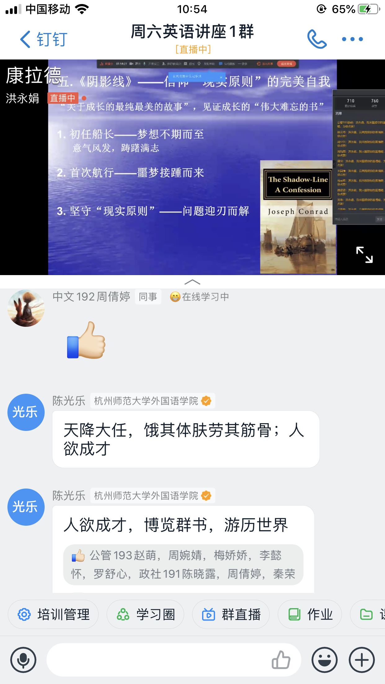 随着周六讲座在学生中的口碑效应,讲座群数目前已增加到3个,加入讲座群的学生总人数已达到1935人,由于部分学生时间冲突,截止到5月23日晚12点,本次讲座实际参与学生数为1253人,已连续六周突破1000人次,同时,依然源源不断有学生选择直播回放,继续在“周六英语学习社区”里努力学习。学生来源主要为2019级非英语专业的学生,同时,也吸引了部分英语专业及浙江麻将胡了 的学生来参加学习,观看直播的总人次达到1701次。