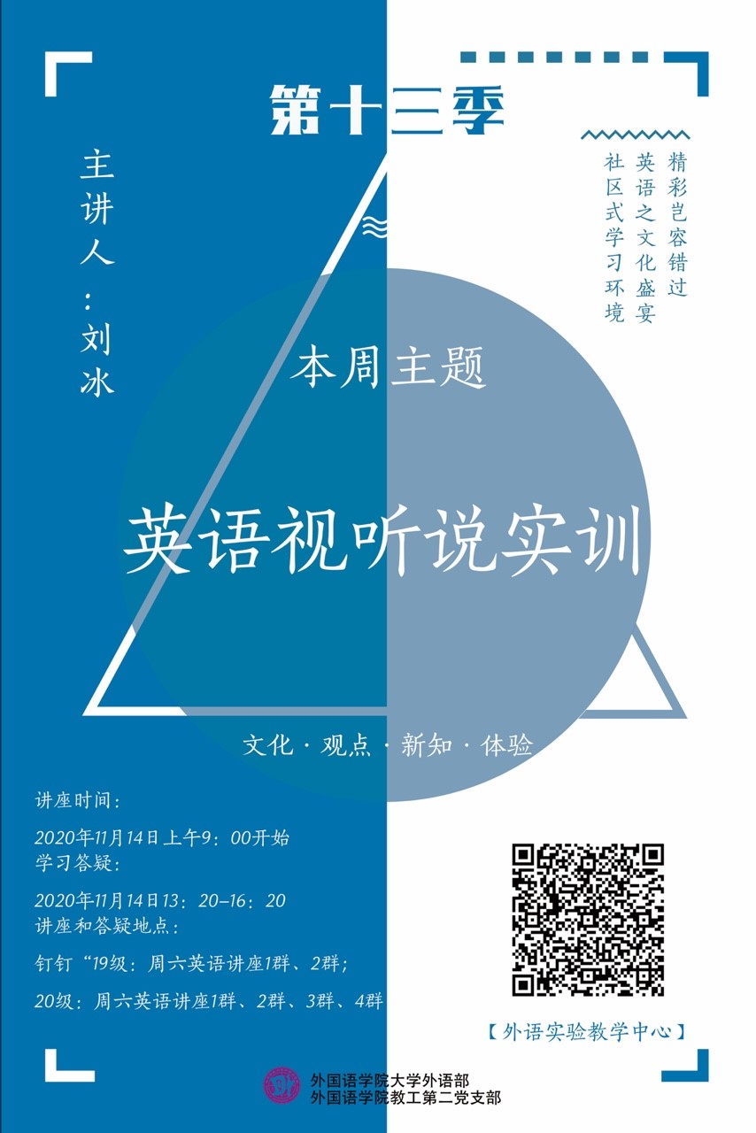 为更好地服务广大学生、满足其对英语学习的多样化和个性化需求,结合大学英语教学改革的实际,为在校学生营造良好的社区式英语学习氛围,从而提升学生的英语综合能力,大学外语部和教工第二党支部为全校学生开设的周末英语专题讲座活动目前已经进入了第十三季第四期。